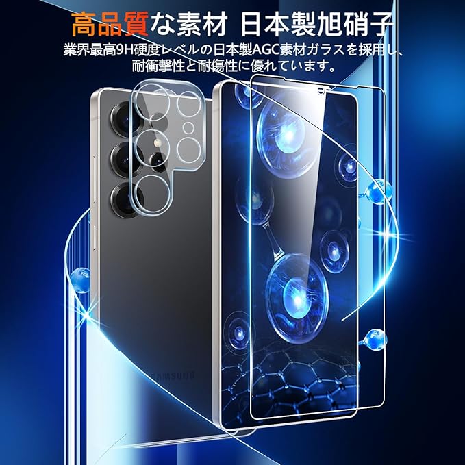 【飛散防止可能の9H硬度】 対応 ギャラクシーS25 Ultra ガラスフィルムとレンズ保護フィルムはすべて旭硝子で作られており、スマホ保護フィルムの中で最高レベルの9H硬度に達しています。手にフィットして持ちやすく滑りにくいので落ちにくいです。万が一落ちてもフィルムが衝
