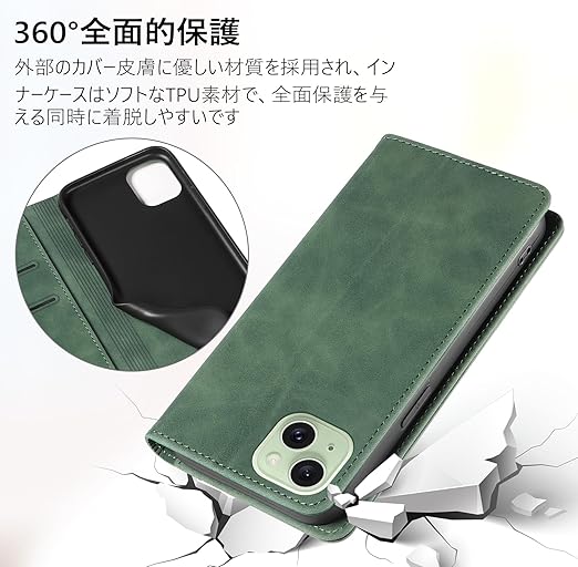 KWATUNG アイフォン 15 ケース 手帳型 おしゃれ iPhone 15 手帳型ケース 肌感レザー iPhone 15 カバー 内蔵マグネット耐衝撃 iphone15 スマホケース 手帳型 カード収納 スタンド機能 あいふぉん15ケース手帳型 全面保護 アイフォン 15 手帳型 ケース 6.1インチ グラスグリーン a