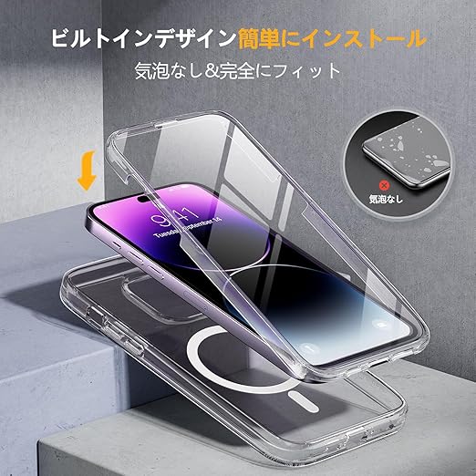 【360°スマホケース】iPhone14pro 用 ケースは高品質9H強化ガラスとソフトTPUバンパーの三層構造、透明なリアプレートはあいふぉん14pro本体のオリジナルカラーの美しさを犠牲なく、その同時に傷や衝撃などから守ります。iPhone14pro 用 ガラスケースは高感度スクリーンガラスフィルムはすぐにインストール、気泡やズレなどのトラブルの心配がなく、アイフォン14プロスクリーンにフィットします。