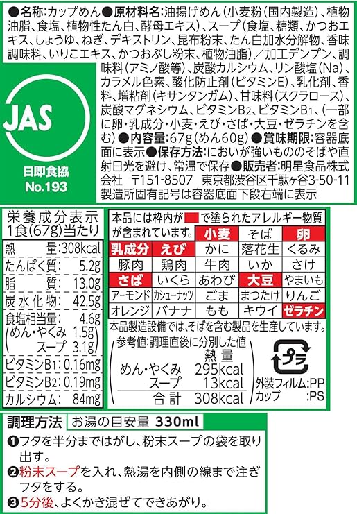 油揚げめん(小麦粉(国内製造)、植物油脂、食塩、植物性たん白、酵母エキス)、スープ(食塩、糖類、かつおエキス、しょうゆ、ねぎ、デキストリン、昆布粉末、たん白加水分解物、香味調味料、いりこエキス、かつおぶし粉末、植物油脂)/加工デンプン、調味料