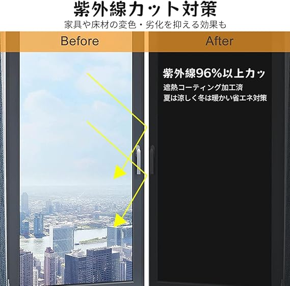 【遮光・遮熱・紫外線カット】強い日差しを遮断し、UV96%以上カット。日焼けによる褪色・劣化から家具を守ります。熱の損失と取得が減少し、省エネにも繋がります。
