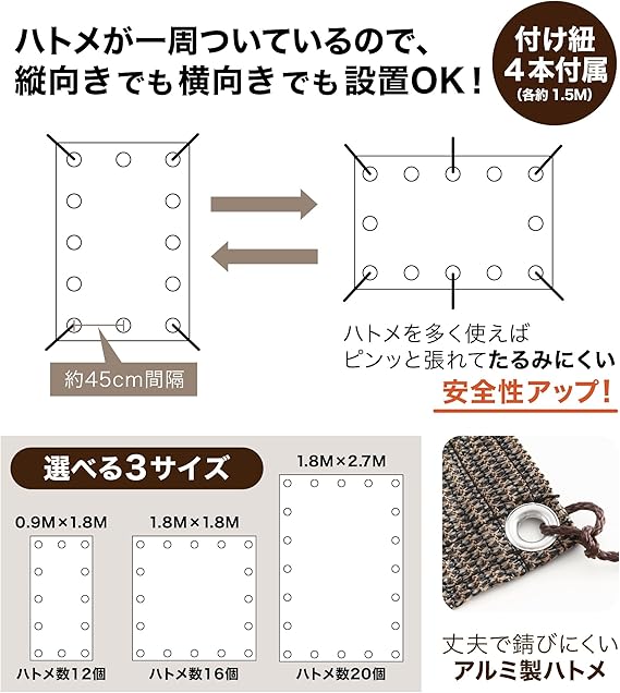 風を通す通気タイプの為、熱もこもりにくく、明りも適度に取るので室内も暗くなり過ぎません。ベランダ、玄関での使用はもちろん、キャンプ、BBQ等アウトドア時の日除けとしても大活躍します。