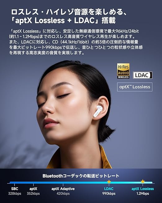 これまでのホワイトとの違いは、以前のホワイトは側面がシルバー仕上げでしたが、今回の新色はイヤホン全体が美しい白で統一されています。【先進の技術ソリューション& aptX Losslessロスレス音声伝送】EarFun Air Pro 4は、Qualcommの最先端チップ「QCC3091」を採用。最新のBluetooth規格(V5.4)と 最新のオーディオソリューション「Snapdragon Sound」に対応し、高音質と低遅延を実現します。「aptX Lossless」に対応し、安定した無線通信