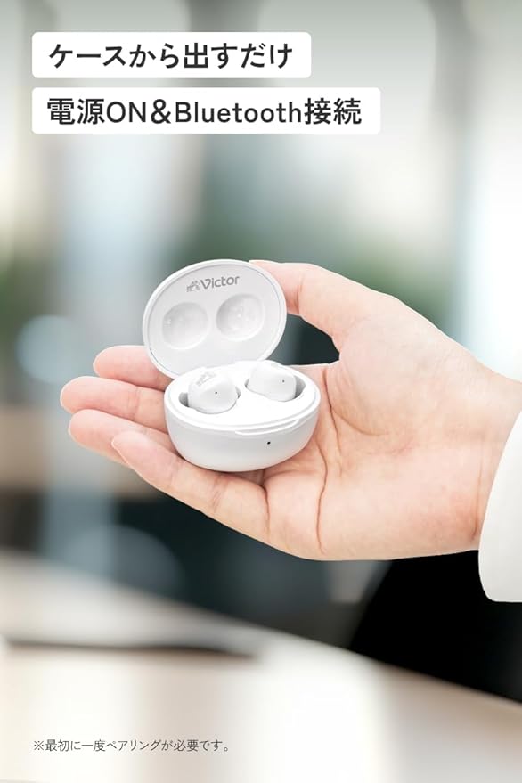 【コンパクトで持ち運びもしやすい充電ケース】 充電ケースは、本体のデザインに合わせてラウンド型を採用。質量は約30gと軽量で、手のひらに収まるコンパクト設計とし、持ち運びやすさにも配慮しました。