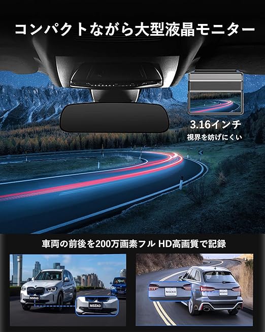 NISEKO ドライブレコーダー 前後カメラ 前後200万画素 24時間 駐車監視 動体検知 【上下可動式フロント&360°回転のリアカメラ】 車用 小型 ドラレコ フルHD画質 HDR機能 超大広角レンズ 常時録画 車内撮影可能 音声録音 車載カメラ 12V/24V対応 コンパクト 3.16インチモニター 分割表示&SDカードチェック機能 64GBmicroSDカード a