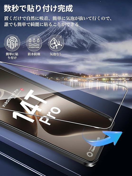【適用機種】Xiaomi 14T Pro 対応のガラス保護フィルム(2枚)とレンズフィルム(2枚)です。スマホの液晶画面やカメラレンズどちらも保護できます。
