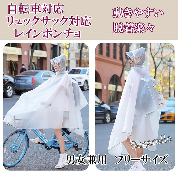 [sugarello] レインポンチョ 男女兼用 レインコート リュック対応 自転車用 フリーサイズ 軽量 蒸れない EVA素材 雨合羽 サイクル仕様 通勤通学 レインウェア 通学 通勤