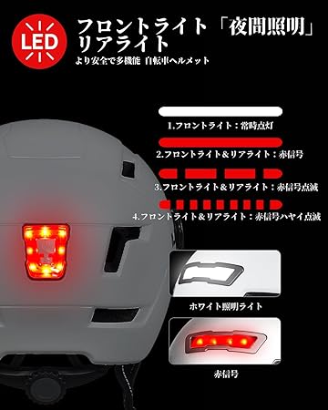【LED照明ライト&リアライト】ヘルメットの前後に充電式LEDライトを搭載しており、3つ点灯モード:①フロント照明モード②フロント警告灯モード③リアライトモード