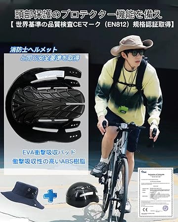 【安全性能とデザイン性を両立・着脱式内装】最新 ハット型 自転車ヘルメット、一般的なヘルメットよりもスタイリッシュな外観で。インナープロテクターはABS製で、頭の損傷、擦り傷およびその他の軽度の頭部の損傷を防ぎます。EVA衝撃吸収パッドも衝突による頭部の損傷を軽減できます、快適性と保護を両立させています。アウターシェル(ナイロン) スタイリッシュなハットにインナーヘルメットを内蔵した簡易ヘルメットの登場!