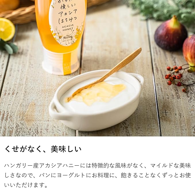 【固まらないから、使いやすい】ハンガリー産アカシアハニーは結晶化しにくいので固まりにくく、いつでもサッとお使いいただけます。アカシアハニーのチューブボトルは蜂蜜のキレが良い特別な容器を使っており、手がベタベタになることもありません。どなたでもカンタン