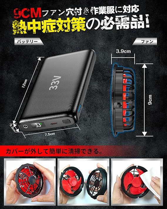 空調作業服 ファンバッテリーセット 33V 超高出力 2025最新 26000mAh大容量 日本製ブラシレスモーター 187L/S暴風ファン 超軽量 バッテリー 4段階風速調節 9cm服穴径対応 作業ジャケット 空調ウェア用 空冷調節作業服 ワークマン ファン付き作業着長袖 半袖アクセサリー 暑さ対策 釣り 男女兼用