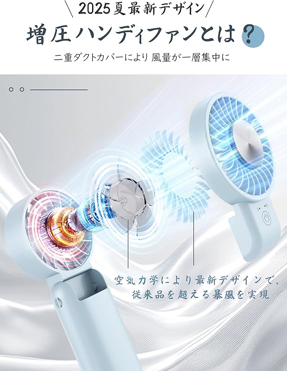 【2025年新登場・空気力学による増圧設計】携帯扇風機は、持ち運び可能な小型の扇風機のことで、ハンディー扇風機、小型扇風機、ミニ扇風機、ポータブル扇風機など、様々な名称で呼ばれています。 今回は2025最新デザインで、二重ダクトカバーによって、風量が一層集中になり、従来品を超える暴風を実現しました。普通の扇風機 手持ちと比較すると、風の当たる範囲が広くなるだけでなく、風が強くなります。最新のブラシレスdcモーターを採用して、従来型より騒音を80%減少されるし、耐久性も高くて、省エネ、静音といった
