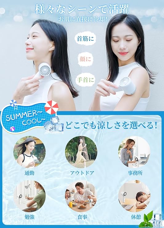 【2025年新型冷却機能付きハンディファン】冷却プレートを備えたハンディファンでスイッチを押すと、冷却ブレードが瞬時に冷却を開始します。血管や皮膚に最も近い部分にぴったりとフィットして体を素早く冷やし、まるで氷を肌に密着させているようなひんやり感が肌から伝わっていき、体感温度がMAX-15℃まで下げられ、汗の不快感も爽やかに変えて、炎天下でも冷え冷え。風がまっすぐ届くので、首元や体を短い時間で冷やすことができます。