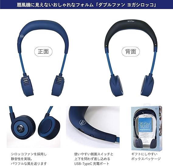 両手が使える ハンズフリー 首掛け扇風機 WFan ダブルファン ヨガシロッコ ネイビー SPICE OF LIFE(スパイス) 静音 5段風量 650分連続使用 首かけ フィット感 ニッケル マスクファン 熱中症対策 リズム風 USB 500回充電 DFYS213NY a