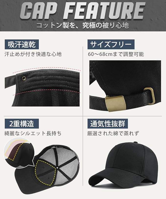 [Andeor] キャップ メンズ 大きいサイズ 帽子 【特大60-68cm・UPF50+測定済み・2重型崩れにくい】 キャップメンズ 深め 紫外線対策 メッシュ 刺繍 シンプル おしゃれ 野球帽 調整可能 ゴルフ アウトドア 男女兼用 四季 3タイプ展開