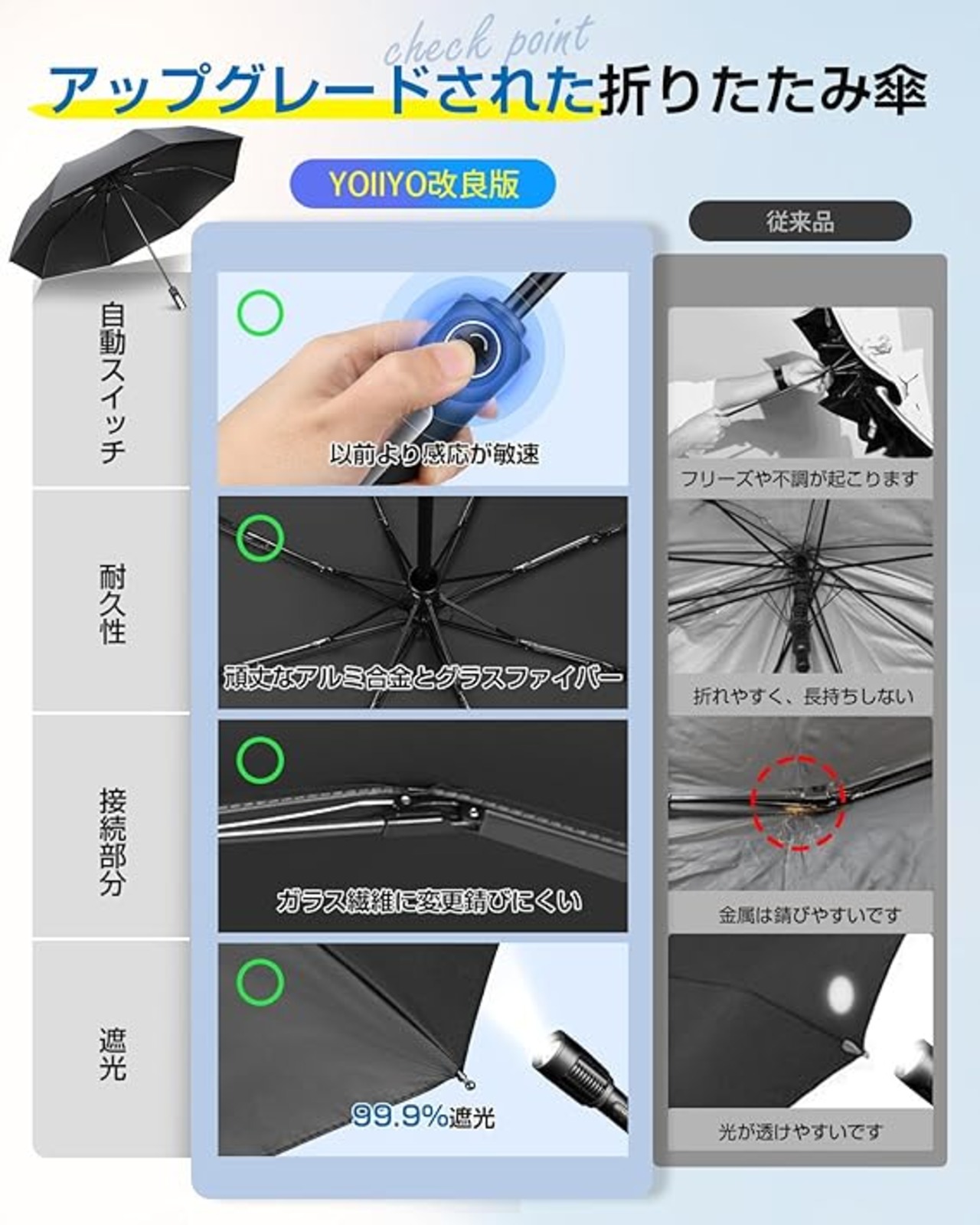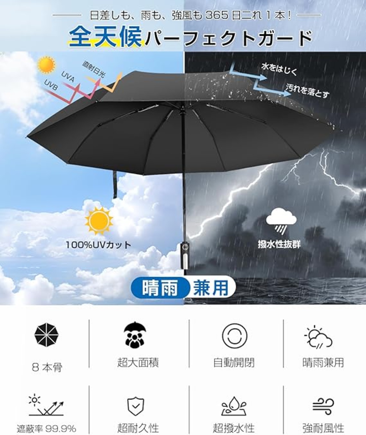 YOIIYO 折りたたみ傘 ワンタッチ自動開閉 折り畳み傘 大きいサイズ 晴雨兼用 丈夫 軽量 8本骨 強風に強い 豪雨対応 紫外線遮断 UVカット 完全遮光 日傘 コンパクト おりたたみ傘 折畳傘 メンズ レディース 収納ポーチ付き