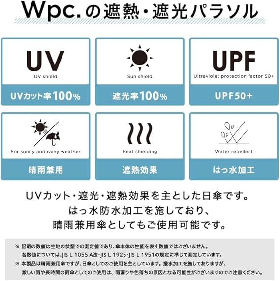 【遮光率・UVカット率100%、UPF50+】 全カラー遮光率・UVカット率ともに100%、UPF50+を実現し、日差しからお肌を守ります。 日焼けを防ぐために必要なUVカットの性能を兼ね揃えた、紫外線対策にはピッタリの日傘です。 涼しく過ごすための遮熱性も優れているため、暑い夏の熱中症対策にも。