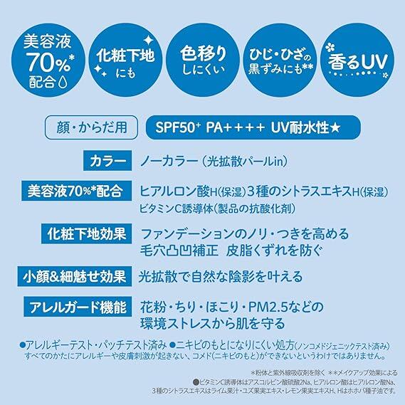 サンカット ライトアップ UV エッセンス SPF50+ PA++++ UV耐水性★ 80g 顔・からだ用 日焼け止め 美容液70%配合 化粧下地 透明感 アップ 花粉・ほこり・P2.5ブロック KOSE a