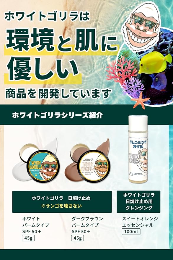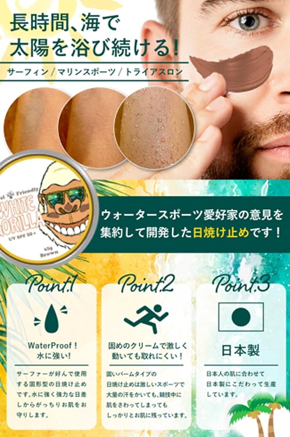 (White Gorilla) ホワイトゴリラ 【45g】 日焼け止め UV SPF50 + 南国ブラウン 褐色の日焼けした肌 小麦肌 専用 珊瑚を壊さない UV バーム ウォータープルーフ CORAL FRIENDRY マリンスポーツ サーフィン 落ちない日焼け止め メンズ (濃い茶色(Brown)) a