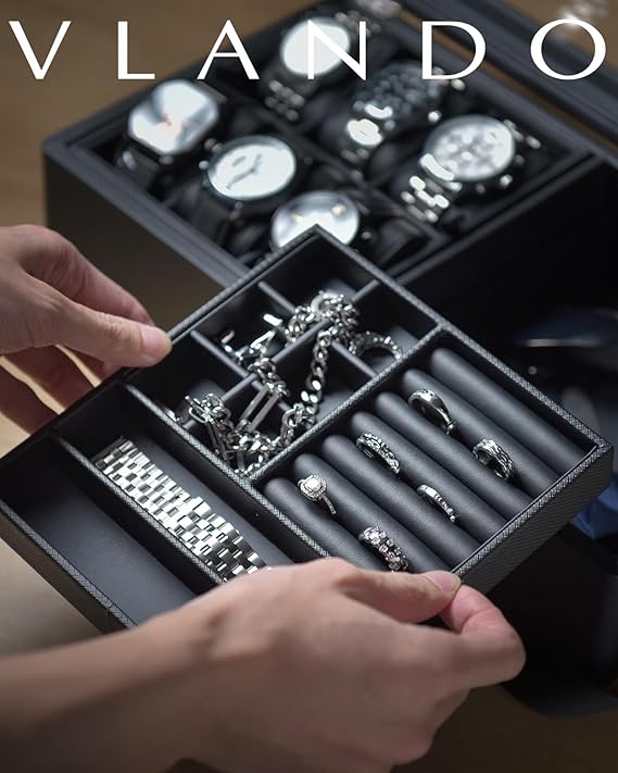 精巧な作工 - Vlandoの時計ケースは、質の高い細菌皮革と皮革の内側を使用して作成されており、整いの良いステッチングと高品質のロック(鍵を含む)を特徴としています。ロック可能な時計ボックスオーガナイザーは堅牢で耐久性があり、貴重品を安全に保管します。