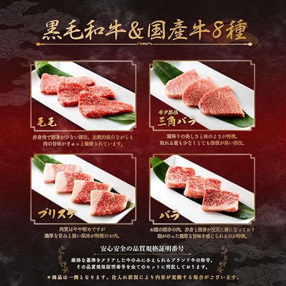 お届け内容 黒毛和牛希少部位60g(仕入状況により選定)、黒毛和牛バラ焼肉用60g、黒毛和牛肩ロースすきしゃぶ用80g、国産牛もも焼肉用60g、黒毛和牛ブリスケ焼肉用60g、黒毛和牛ランプorブリスケor国産牛とうがらしor国産牛ももすきしゃぶ用80g、黒毛和牛サーロインステーキ100g、黒毛和牛赤身ステーキ100g(イチボorランプ)