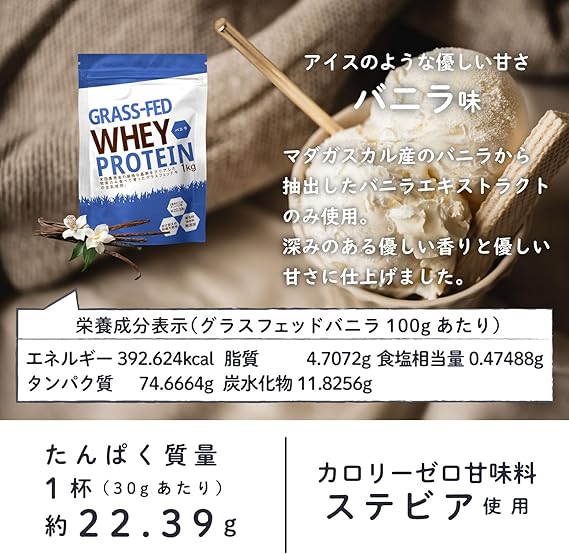 【バニラのホエイプロテイン】オーストラリア南東部のビクトリア州の沿岸地域 は、偏西風の影響で自然降雨に恵まれ、豪州で最も酪農に適した地域グラスフェッド牛由来の生乳から抽出された高品質の粉末タイププロテイン。マダガスカル産のバニラエキストラクト使用。