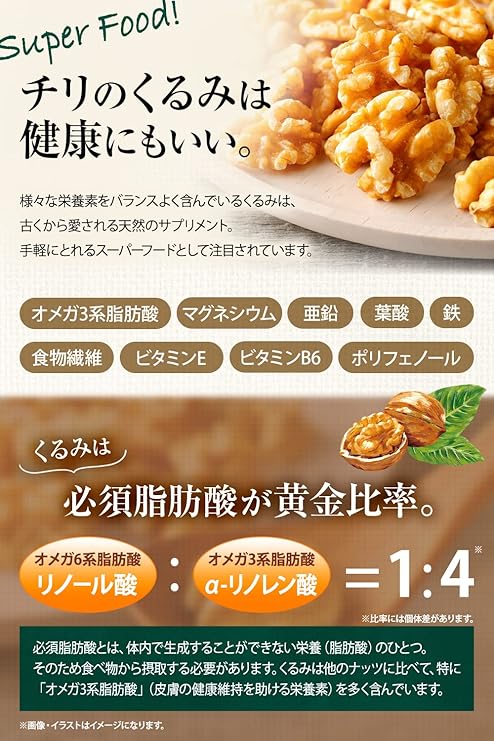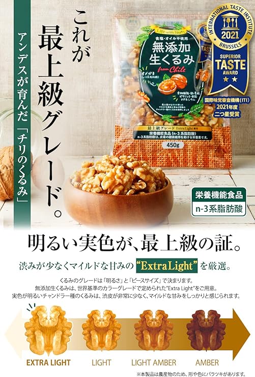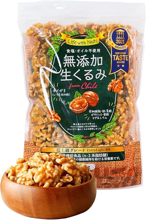 【二つ星受賞 無添加生くるみ】ITI(国際味覚審査機構)で二つ星を受賞。最上級グレード「ExtraLight」を厳選。実色が明るく、温暖な気候で育ったチリ産のくるみは明るい色味が特徴。※農作物のため形や色にバラツキがあります。風土豊かなチリで育ったマイルドな風味と甘みが特徴のチャンドラー種のクルミになります。