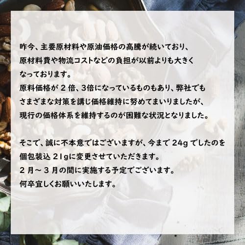 アーモンドとカシューナッツは素焼きです。クルミは生です。21g入りが30個入っています。