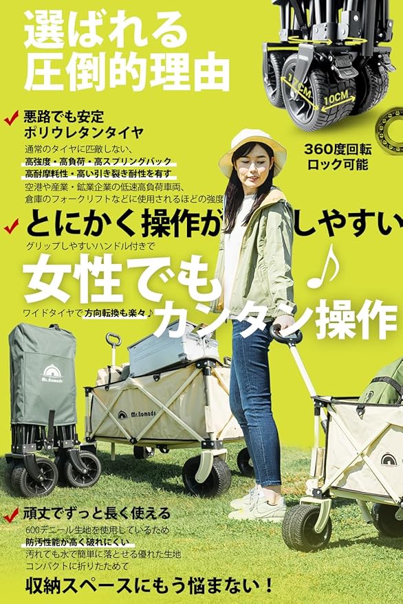 【悪路でも安定するポリウレタンタイヤ】高強度、高スプリングバック、高耐摩耗性、高い引裂き耐性などの特性を有したポリウレタンタイヤを採用。重い荷物をのせて段差のある場所、芝生や凸凹道、ぬかるみ、舗装路、砂利道、砂浜な