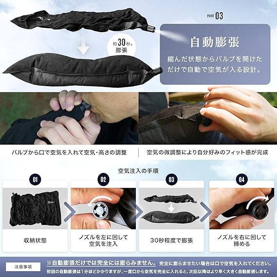 コンパクトに収納した状態からバルブを開くだけで自動で膨らんでくれる枕で、30秒もあれば十分使用できる大きさまで膨らんでくれます。