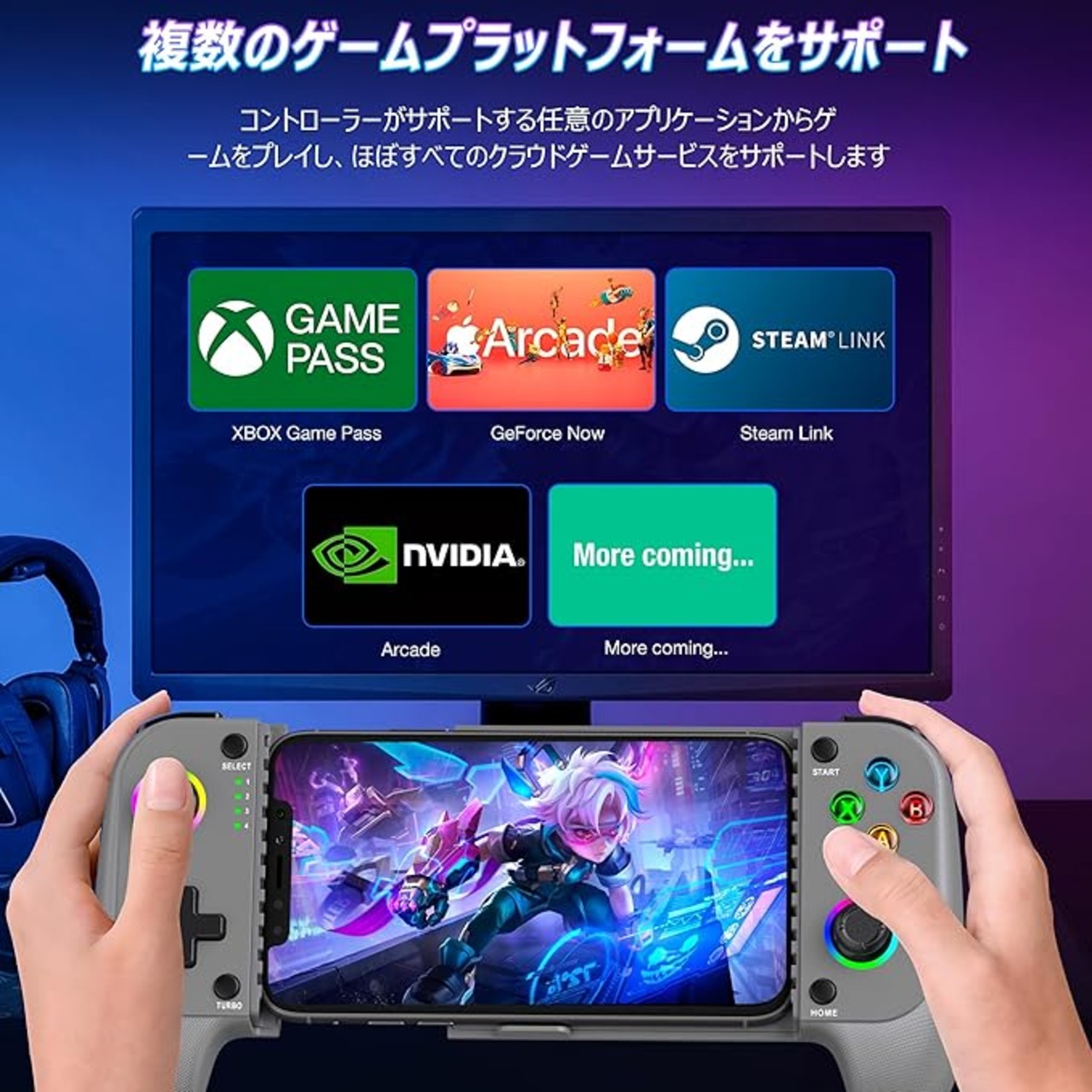 【モバイルゲーム専用コントローラー】任意のコントローラー対応ゲームをシームレスにプレイ可能。Xbox Game Pass、Playstation Remote Play、Steam Link、GeForce NOW、MFi Apple Arcade、Google Stadia、Rainwayなど、クラウド型ゲーミングサービスにも対応。また、Fortnite、Minecraft、Roblox、Genshin Impact、Among Us、Brawlhalla、Asphalt 9: Legends