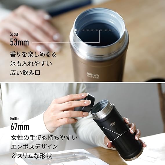 【香り立つ飲み口】飲み口は、コーヒーの香りを楽しめるように大きめ設計の53mm。コーヒーカップで飲むときのような豊かな香りをお楽しみ頂けます。氷も入れやすいので、アイスコーヒーにも便利