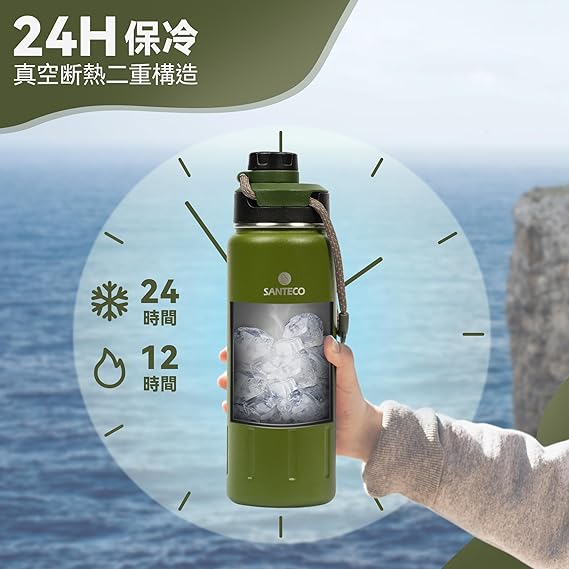 SANTECO 水筒 710ml スポーツボトル 保温 保冷 真空断熱 直飲み 魔法瓶 漏れ防止 持ち運び ごくごく飲める設計 ステンレスボトル スポーツ飲料 山登り 旅行 グリーン a