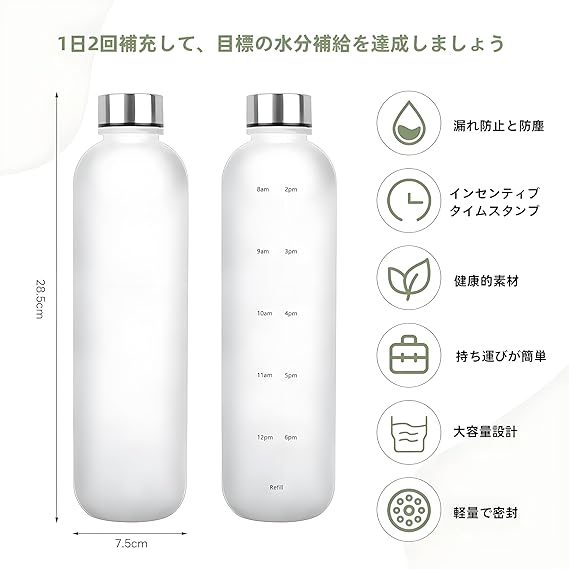 2.ウォーターボトルにはタイムマーカー付き、定期的な水分補給を促し、1000mlの大容量で毎日十分な量の水を飲むことができる、水を飲む習慣をつける。この目盛りを守ることで、毎日無理なく健康的に十分な量の水を飲むことができる。