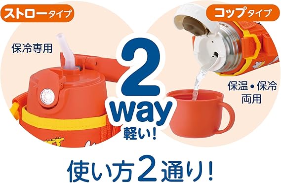 直接飲める保冷専用ストローボトル、コップと中せんを付けて、保温・保冷両用のステンレスボトルにもなる2ウェイボトル。専用ポーチ付き
