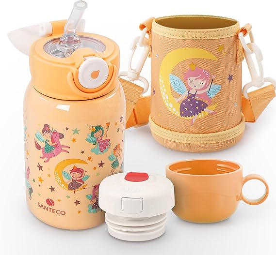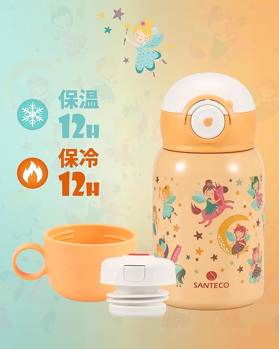 SANTECO 水筒 MARA 魔法瓶 450ML 子供用 ストロー付き 直飲み 2Wayタイプ スポーツドリンク対応 炭酸対応 保冷 保温 真空断熱 広口 316ステンレススチール おしゃれ 可愛い 子ども 小学生 キッズ 男の子 女の子 フェアリー a