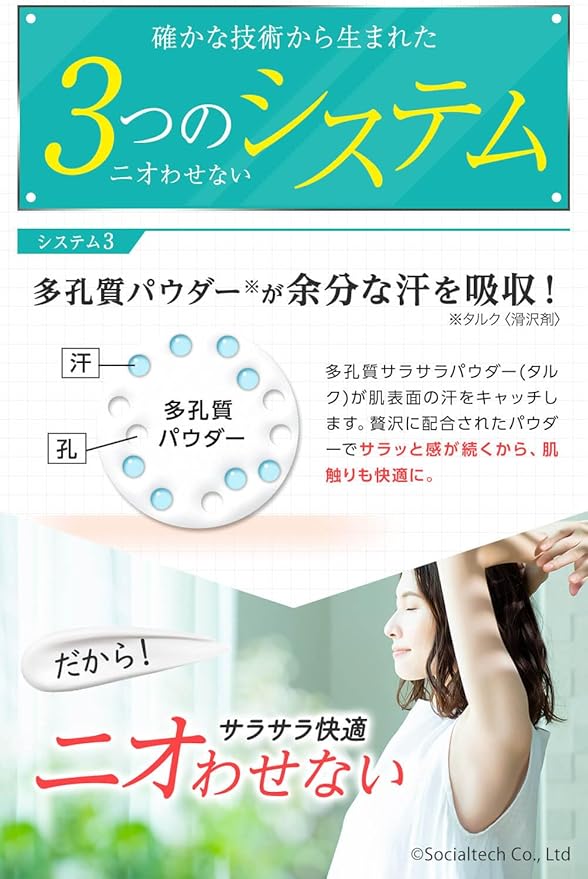 わきが臭対策に。発汗による皮膚汗臭のほか、加齢による酸化臭・脂臭も抑えます。ニオイの原因菌を殺菌、強力抑臭、高純度保湿が同時に可能。肌環境正常化への近道です。