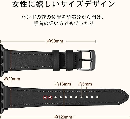 対応機種:(130mm-190mm)の手首にフィットします。iWatch Series 10/9/8/7/6/5/4/3/2/1/SE/SE2に対応しています。バンドの最小幅は16mmで、小さい穴が11つ開いているため、女性の方々にぴったりのサイズ感があり、大人女性に人気のスリム仕様です。エレガントなデザインで、まるでアクセサリーのように手首を細く見せ、フェミニンな外観を演出します。