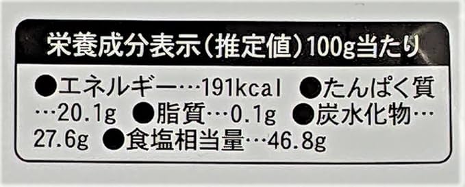 栄養成分: 100g当たり ●エネルギー:191kcal ●たんぱく質:20.1g ●脂質:0.1g ●炭水化物:27.6g ●食塩相当量:46.8g