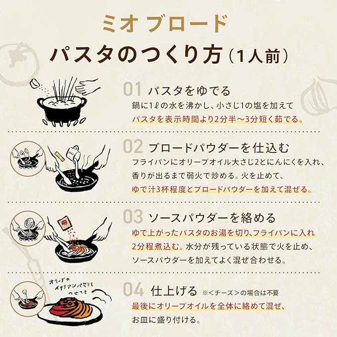 2種類の特製パウダー(「ブロードパウダー」「ソースパウダー」)を順に混ぜ合わせることで、調理初級者の方でも家庭では再現できない香味野菜香る極上パスタを失敗なく作ることができます。