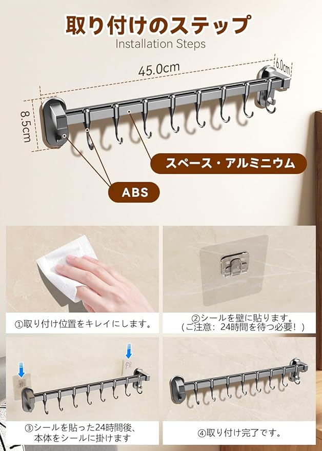 【製品仕様】重量:140g、寸法:45.0x8.5x6.0cm | 粘着シールの寸法:幅5.9x高さ9.8cm、吸着円盤の厚さ:0.4cm | 素材:(ダブルバー)アルミニウム、(コネクター)ABS、(フック)ABS、(粘着シール)PC | ご注意:ダブルバーだけはアルミ製で、ほかの部分はABS製です。ABS製の部分に嫌う方は、ご慎重に注文してください。
