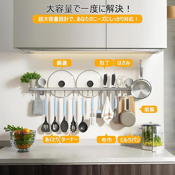 キッチンツールフック 吸盤式 アルミニウム 強力粘着 軽量 防水防錆 調理器具 鍋蓋置き 穴あけ不要 壁掛け 台所収納 強い収納力 可動式 簡単取付 (50cm 10個フック) a a