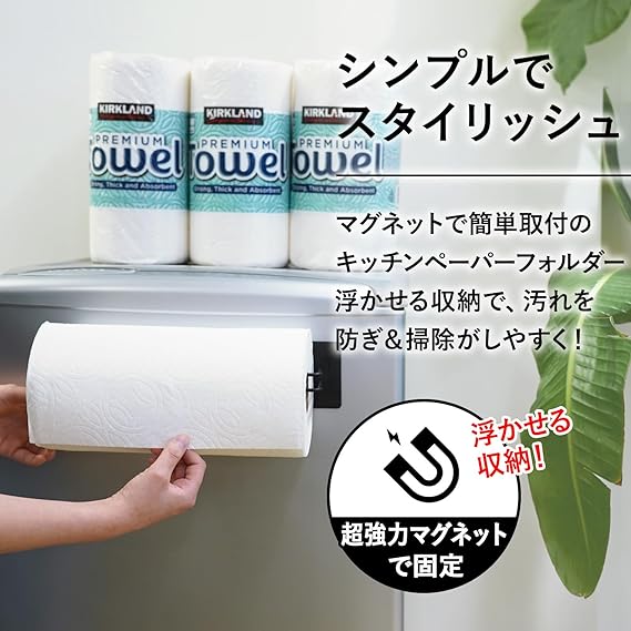【マグネットで簡単、自由に取り付け】左右セパレートのため幅のサイズは自由に、マグネットで簡単に取り付けられます。キッチンペーパーの向きは縦でも横でも場所に合わせて設置可能となっています。冷蔵庫や磁石が付く壁に付けられるキッチンペーパーホルダーは限られたスペースに新たな収納を作ります。
