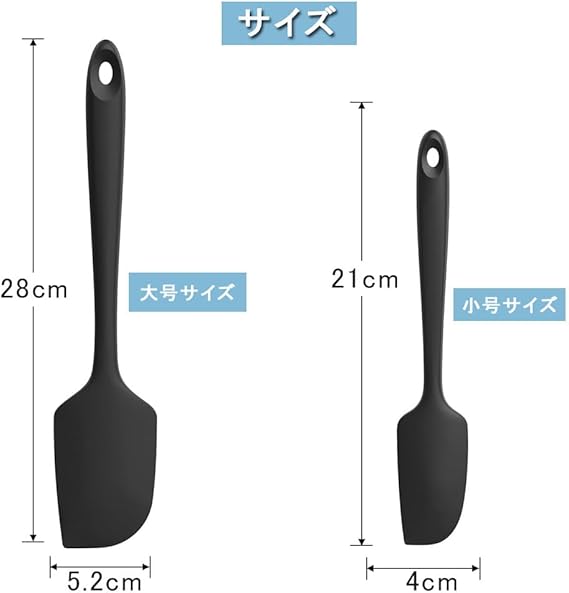 セット内容:ゴムヘラ1個セット、サイズ:約28cm×5.2cm。人体工学に基づいた滑り止めハンドルで、握り心地が快適で使用時の安定性を高めます。また、取り付け用の穴が付いており、吊り下げて収納できるので、キッチンのスペースを節約できます。