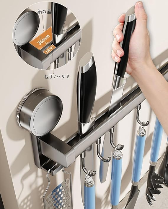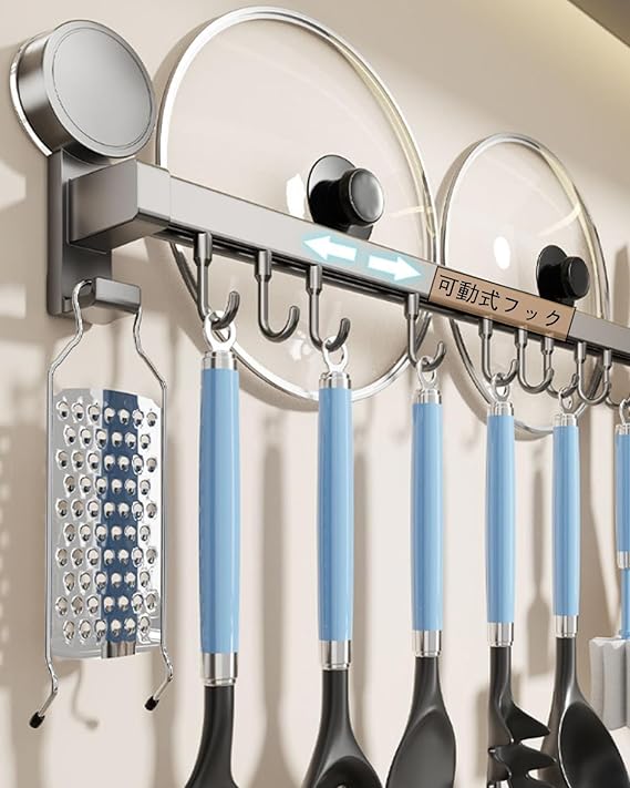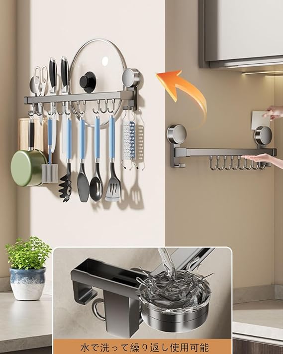 【革新を遂げた強力吸盤】当社のこのキッチンツールフックは、全面アップグレードを実現した真空吸盤を採用。ダブルバーはアルミ製と外装部にはABS樹脂を、吸盤と壁面の接続ディスク部分には最新のTPE素材を使用。ワンプッシュで真空状態を瞬時に形成する、時間の経過とともに増強する吸着力で確実に固定。剥がれにくい特性を持ちながら、取り外し時も壁面を傷つけず、繰り返し使用可能な設計となっております。