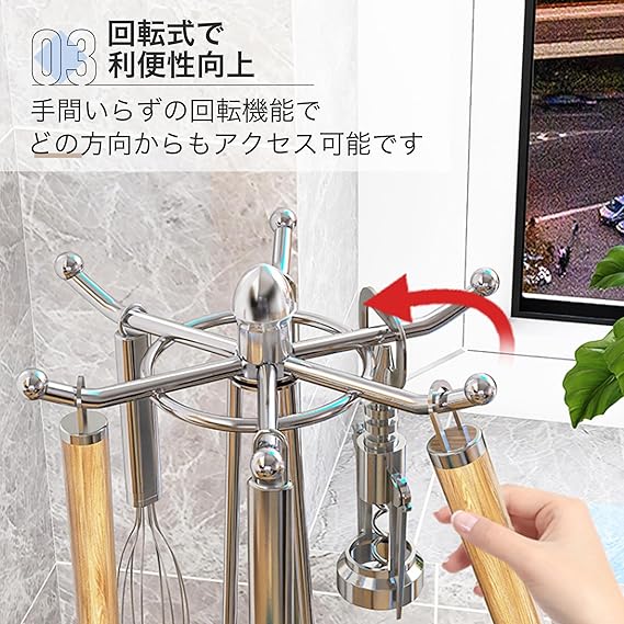 【スリムでも収納力抜群】 無駄を省いたデザインで、キッチンを広く見せて調理器具をすっきりまとめます。 回転式なので必要なツールをサッと取り出せます。
