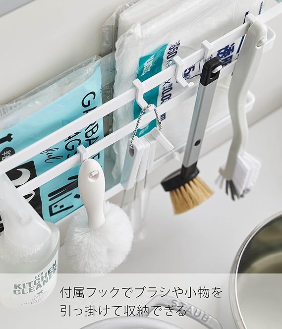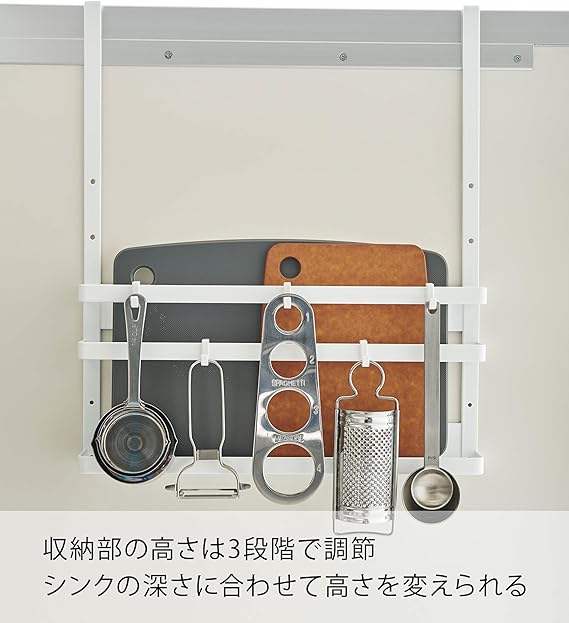 付属品:六角レンチ フック×5 クッション×2 ・備考:組立式 高さ3段階調節(5cm間隔) ・取り付け可能な扉:扉の幅:約38cm以上(扉のハンドル、丁番含まず) 扉の厚さ:約1.5~2.2cm以内 扉と上部との隙間:約3mm以上 シンクの深さ(シンク手前の板の高さ)