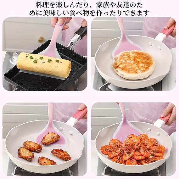 【ピンクのシリコンフライ返し】:ピンク色の25.5×12cmサイズのシリコンフライ返しで、耐熱性に優れ、フライ返し、スパチュラ、シリコン调理器具として多目的使用できます。