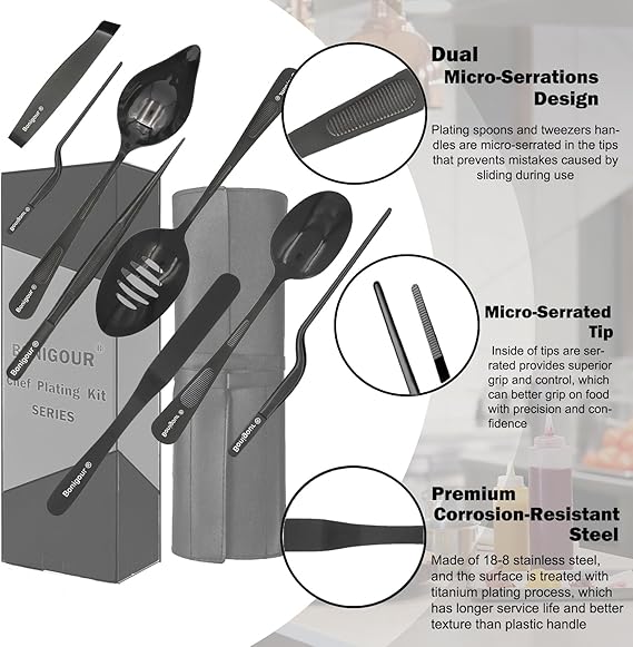 [優れた滑り止めデザイン] Bonigourプロの料理メッキスプーンとメッキピンセットのハンドルは、より良いグリップと安定性のためにマイクロ鋸歯状になっており、最も正確に達成するために、小さなアイテムをつかむと、より良い仕事を維持する