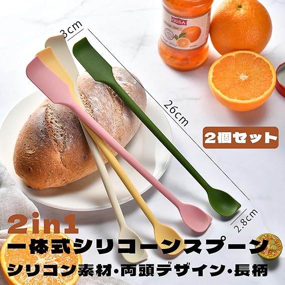 【商品仕様】当社のセットには2本の両頭 シリコンスプーンが含まれており、各ゴムベラの長さは26cm、幅は2.8cmです。色の組み合わせは2種類あり、白/白+黄色/黄色+緑色で、見た目も美しく、実用性も高いです。